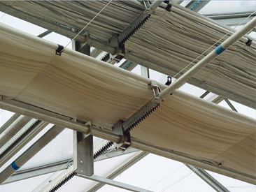 驱动轴与减速电机,减速电机通过驱动轴带动 B型齿轮转动,B型齿轮通过连接件与推杆相连,齿 轮带动齿条推拉杆做往复运动。遮阳幕布通过驱动 边与推杆相连,实现遮阳幕布的展开和收拢。主要 构件:减速电机、B型拉幕齿轮齿条、拉幕(B型) 连接件、焊合接头、推杆、驱动轴、齿条推杆街头、 支撑滚轮等。